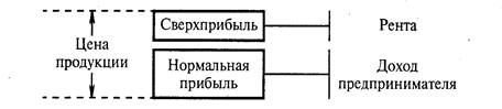Рентные отношения представляют собой отношения между собственником земли и арендатором по распределению прибыли. Одна ее часть - в виде обычной прибыли - достается предпринимателю, а другую долю - в форме сверхприбыли - получает земельный собственник (рис. 1).