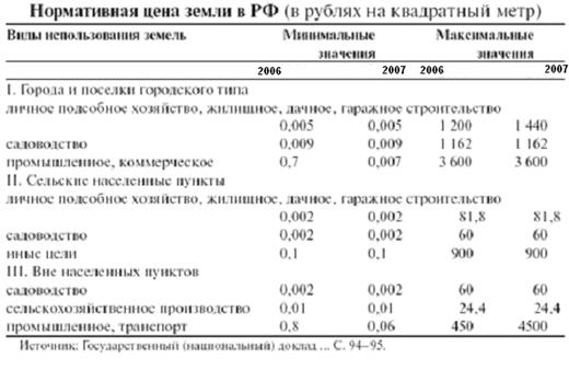 Из-за неразвитости земельного рынка России нормативная цена земли определяется на основе рыночных цен и экспертных оценок только в четверти субъектов РФ. Почти в трети субъектов РФ нормативная цена земли рассчитывается кратно ставкам земельного налога. В Республике Коми, Брянской, Челябинской, Омской, Тюменской, Архангельской областях, Ненецком и Таймырском автономных округах она имеет гибкую шкалу — от 10 до 800-кратной ставки. В других субъектах Федерации, например в Республике Татарстан, Орловской, Тамбовской, Пензенской, Ульяновской, Сахалинской, Амурской областях, Приморском крае, Чукотском автономном округе, она продолжает исчисляться как 200-кратная ставка земельного налога.