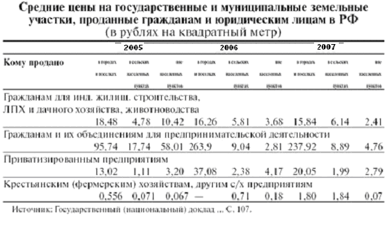 В среднем по России цена на незастроенные земельные участки, предоставленные для жилищного строительства в городах и поселках, в 2007 году колебалась от 3 до 130 рублей; соответственно для личного подсобного хозяйства в сельских населенных пунктах—от 0,01 до 24 рублей за квадратный метр; для садоводства вне населенных пунктов — от 0,05 до 30 рублей за квадратный метр. Распределение земельных ресурсов приведено в приложении.