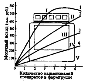 Препараты четвертого и пятого сегментов отличаются самой низкой доходностью, которая неизменно растет по мере расширения ассортимента лекарств /четвертый сегмент – антиаритмические, противопротозойные, противопаразитарные, противоглаукомные, диуретики, противовенерические, оральные контрацептивы, средства от кашля/, /пятый сегмент – сердечные гликозиды, противовирусные, средства против катаракты, слабительные/.