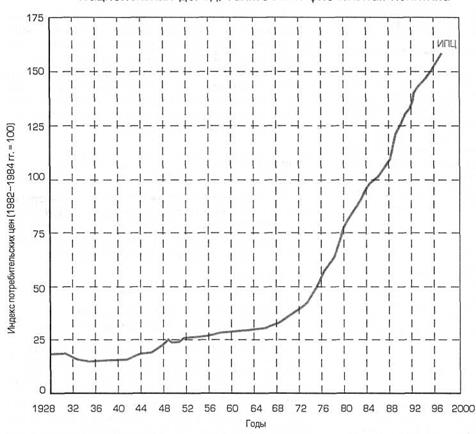 На рис. 1 приводится обзор инфляционных процессов в Соединенных Штатах начиная с 1928 г. Кривая индекса потребительских цен (ИПЦ) отражает его ежегодный рост, базовым периодом для которого избраны 1982—1984 гг. Это значит, что ИПЦ на 1982-1984 гг. принимается за 100.