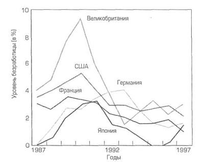 Инфляция — вовсе не исключительно американская прерогатива. С этой проблемой сталкивались все промышленно развитые страны. В рис. 2 представлены годовые темпы инфляции начиная с 1986 г. в США, Великобритании, Японии, Франции и Германии. Заметьте, что инфляция в Соединенных Штатах не была ни слишком высокой, ни слишком низкой по сравнению с другими промышленно развитыми странами.