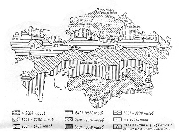 По данной карте-схеме можно судить об эффективности использования солнечных установок для производства электроэнергии, а также о наиболее целесообразном месторасположении данных станций. Как видно по карте наибольшее по длительности в течении года солнечное сияние наблюдалось в южном регионе Казахстана. Однако, в округах городов Шымкент, Тараз, Алматы наблюдалось меньшее сияние, чем по региону в целом. Это произошло из-за расположения данных городов в горных районах, где в течении года небо покрывается тучами чаще, чем в степи.