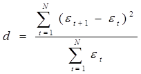 представляет собой «отношение фон Неймана», применённое к остаткам оценки. Этот критерий имеет эффективность аналогичную таковой для критерия r1 , первого коэффициента автокорреляции остатков. Из предыдущей главы известно, что этот критерий будет особенно мощным, если ошибки следуют авторегрессинному процессу первого порядка. Таким образом, он, по-видимому, хорошо приспособлен для экономических моделей.