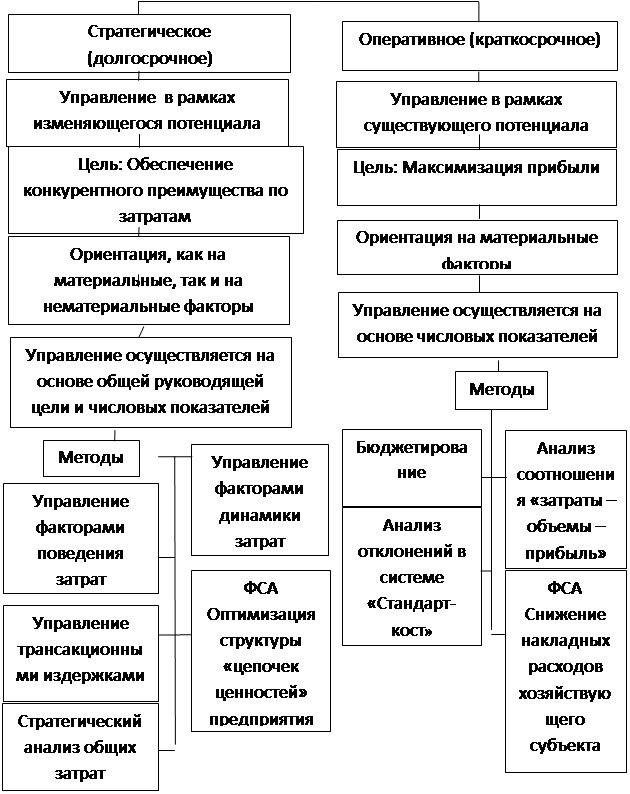 Управление затратами хозяйствующего субъекта как целостная система состоит из двух важных составляющих: стратегического и оперативного уровня управления затратами.
