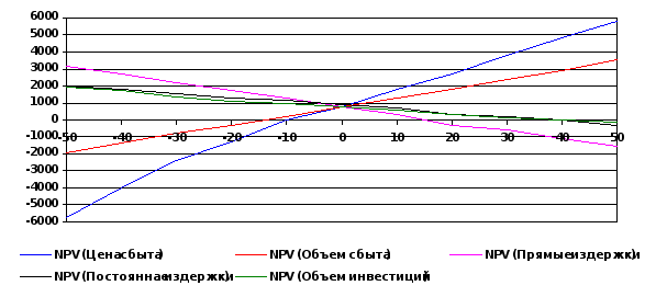 В результате проведенного анализа рассчитываются графики NPV (чистого приведенного дохода) от перечисленных параметров и определяются их критические значения (стр.38).