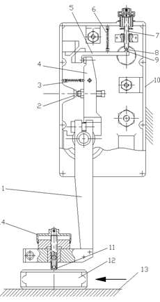 В процессе шлифования под измерительным наконечником прибора первоначально проходят детали, высота которых не достигла подналадочной границы. Эти детали не касаются измерительного наконечника 11. При этом рычаг 1-4 прижат упорным винтом к пятке 2, а контакты 8 и 9 разомкнуты.