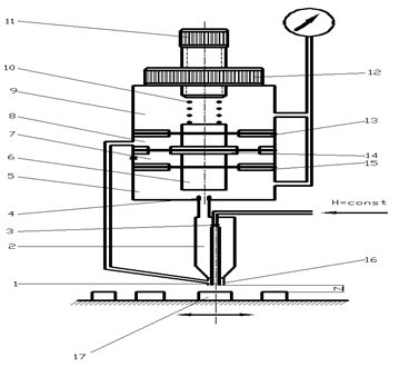 Базовым вариантом для проектируемого изделия является бесконтактный прибор БВ-4066, прибор позволяет контролировать перемещающуюся прерывистую поверхность благодаря специальной конструкции измерительного устройства, схема которого показана на рисунке 2. Сжатый воздух под постоянным рабочим давлением поступает к входному соплу 3, в измерительную камеру 2 и к измерительному соплу 1. Для увеличения предела измерения в этом приборе применена эжекторная измерительная система. Из сопла 1 воздух вытекает в атмосферу через зазор Z, образованный торцами сопла 1, управляющего сопла 16 и деталью 17. Управляющее сопло концентрично с измерительным, и в камере 8 управляющего сопла образуется разрежение из-за отсоса воздуха потоком, вытекающим из измерительного сопла.