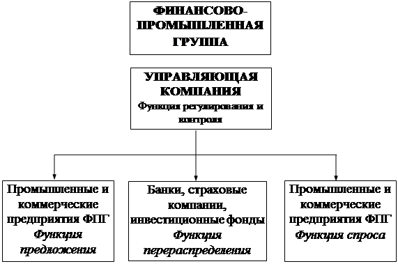 Можно сказать, что финансово-промышленная группа это маленькая финансовая система, в которой имеется свое "государство" (управляющая компания), "кредитная система" (банки, страховые компании, инвестиционные фонды и т.п.), и "субъекты финансовой системы" (коммерческие и производственные предприятия ФПГ), через которые идет формирование и использование финансовых ресурсов ФПГ.