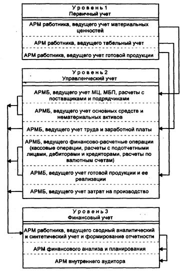 На крупном предприятии обработка учетной информации с помощью БУИС ведется на трех уровнях, соответствующих первичному, управленческому и финансовому учету (рис.16). На каждом уровне в соответствии с методологией сбора, регистрации и обработки учетной информации создаются АРМ экономистов, бухгалтеров, финансистов и аналитиков, взаимодействующие между собой.