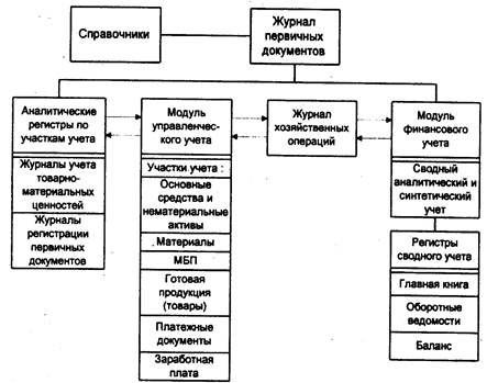 Ведение же учета по отдельным участкам, например, таким, как учет труда и заработной платы, учет готовой продукции и ее реализации, учет основных средств и нематериальных активов, учет материальных ценностей, сводный учет и др., осуществляется посредством применения отдельных программных модулей (блоков). С использованием принципа конструирования создается единый программный комплекс, который ориентирован на пользователя-бухгалтера и охватывает все рутинные и трудоемкие учетные работы. Основная роль бухгалтера в этих условиях сводится к правильности оформления хозяйственных операций, принятию решений, анализу и контролю правильности формирования отчетной документации. Работа бухгалтера становится более рациональной, ПЭВМ превращается в главный инструмент его деятельности.