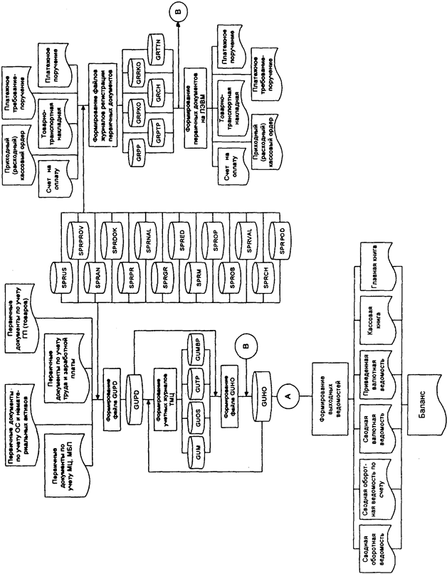 Полученные на каждом участке результирующие данные на основе модемной связи поступают на второй уровень- управленческий учет, который характеризуется трудоемкими ручными операциями, а также большими объемами учетных номенклатур. На этом уровне данные первичных документов и информация, полученная по электронной почте с нижнего уровня, регистрируются и группируются в системе синтетических и аналитических счетов. Для этого сведения об остатках хозяйственных средств и их источниках, а также данные текущих хозяйственных операций отражаются в различных учетных регистрах. На втором уровне функционирует группа АРМБ (по учету материальных ценностей, основных средств и нематериальных активов, труда и заработной платы, финансово-расчетных операций, готовой продукции и ее реализации, затрат на производство). Она формирует результирующие данные, отражающие все хозяйственные операции предприятия в стоимостной оценке, в виде файлов бухгалтерских проводок.