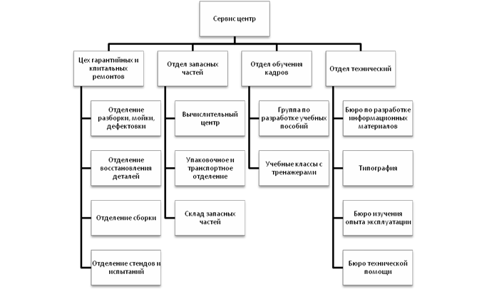 Структура службы сервиса обычно представлена центральным и периферийным аппаратом. Последний максимально приближен к основным местам эксплуатации приобретаемой у изготовителя техники.