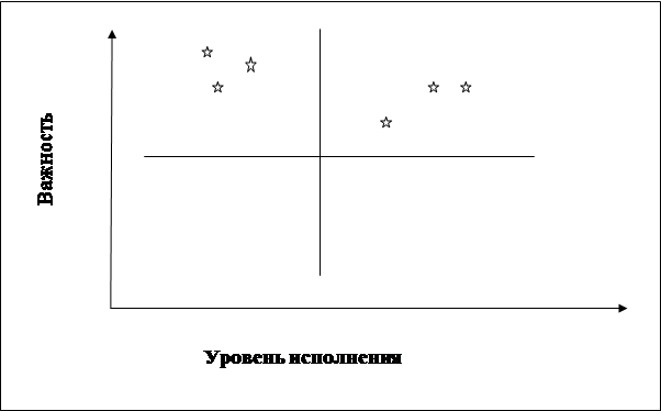 Один из простых, но наглядных способов увидеть ситуацию с качеством - матрица "уровень исполнения - важность". Она применяется во многих областях маркетинга и позволяет выделить требующие особого внимания аспекты работы предприятия. Вертикальная шкала этой матрицы отражает важность того или иного показателя работы, горизонтальная - уровень показателя. В случае системы стандартов качества услуги, мы располагаем на этой матрице отдельные числовые показатели, которые вошли в нашу систему стандартов - каждая точка на матрице представляет один показатель. Показатели различаются по своей важности - они дают различный вклад в общую оценку качества услуги. Это дает нам возможность разместить их на матрице по вертикальной шкале (по важности). Конкретные значения показателей в течении, например, месяца и величина их отклонения от заданных стандартных значений позволяет нам разместить их и по горизонтальной шкале матрицы (по уровню исполнения).