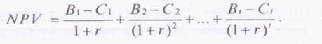 Чистая текущая ценность (NPV) - дисконтированный показатель ценности проекта, определяется как сумма дисконтированных значений нетто-поступлений, получаемых в каждом году в течение срока жизни проекта. Любой проект, дающий положительное значение NPV при выбранной ставке дисконтирования (обычно принимается равной альтернативной стоимости капитала) является приемлемым. NPV является наиболее широко используемым показателем для выбора из сравниваемых взаимоисключающих проектов.