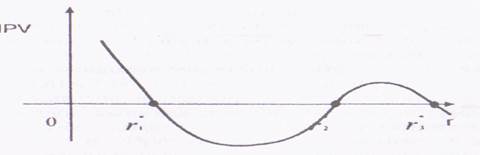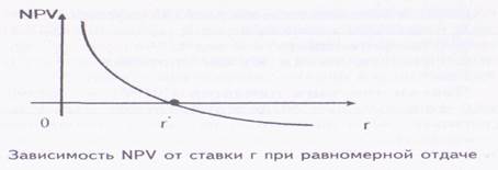 Например, проанализируем зависимость NPV от ставки г для случая, когда вложения осуществляются в начале процесса, а отдача - равномерная. Когда процентная ставка достигает некоторого значения г, эффект инвестиций оказывается нулевым. Любая ставка, меньше чем г*, соответствует положительному значению NPV (рис.1).