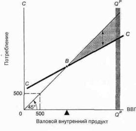 Обратите внимание, что обе функции являются зеркальным отображением друг друга: точка постоянного богатства обозначена В. Это точка пересечения линии потребления с линией 45° на верхнем графике, и точка пересечения с горизонтальной осью на нижнем графике. Постарайтесь самостоятельно объяснить, почему вертикальные отрезки, отмеченные на обоих графиках стрелками, равны между собой. Каждая точка на линии 45 находится на равном от осей расстоянии. Серая полоса qpqp соответствует потенциальному уровню ВВП анализа цены и ставки зарплаты все же будет необходимо принять в качестве переменных, поскольку изменения совокупного спроса, потенциального объема выпуска и издержек производства, которые имеют место по условиям длительного периода, в той или иной степени сопровождаются реакцией с их стороны.