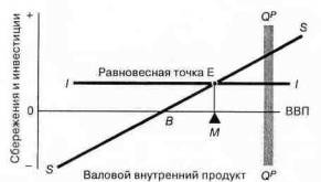 Линии сбережений и инвестиций пересекаются в точке Е. Эта точка соответствует ВВП в размере М и