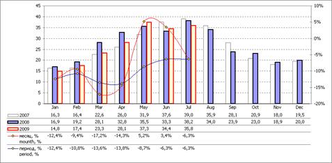 Рис.3.4. Щомісячна динаміка виробництва пива в Україні у 2007 – 2009 роках (за даними Держкомстата України)