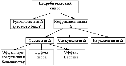 Наряду с общими принципами выбора рационального потребительского выбора существуют особенности, которые определяются влиянием на него рыночного спроса, а также вкусов и предпочтений. Эти факторы обуславливают функциональный или нефункциональный характер спроса (Схема 3)