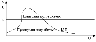 Теория предельной полезности показывает, что любой индивидуум, предъявляя спрос на тот или иной товар, сугубо объективно оценивает свой бюджет и предельную полезность единицы товара. Дополнительная полезность, которую потребитель получает за счет разницы между тем, что он готов отдать за приобретаемое благо и тем, что он отдает в действительности будет составлять прибыль (выигрыш) потребителя. Если же приобретаемый товар оценивается ниже, чем его стоимость потребитель имеет проигрыш. Графически такое состояние потребителя можно показать следующим образом (Схема 4)