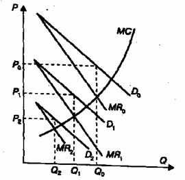 Поскольку рыночный спрос есть величина заданная, расширение производства фирмой вызовет сокращение спроса на продукцию фирмы Х. На рис. 3.3 показано, как сместится график спроса на продукцию фирмы Х (он будет сдвигаться влево), если фирма У начнет расширять продажу. Цена и объем производства, устанавливаемые фирмой Х исходя из равенства предельного дохода и предельных издержек, будут снижаться соответственно с Р0 до Р1, Р2 и с Q0 до Q1, Q2. [20, c.247-248]