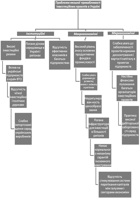 Основна причина наявності цих факторів - відсутність чіткої державної політики щодо економічного розвитку взагалі, і залучення інвестицій (як іноземних, так і внутрішніх) зокрема. Так, існуюче в даний час велике розходження в розвитку центральноєвропейських країн і сусідніх країн у Східній Європі залишає все менше можливостей для аутсайдерів при змаганні за залучення іноземних інвестицій. Сьогодні від ефективності інвестиційної політики залежать стан виробництва, положення і рівень технічної оснащеності основних фондів підприємств народного господарства, можливості структурної перебудови економіки, рішення соціальних і екологічних проблем. Інвестиції є основою для розвитку підприємств, окремих галузей і економіки в цілому. Під час економічної нестабільності інвестиційна діяльність в Україні значно знизилася. Попит на інвестиції падав значно швидше, ніж виробництво валового продукту. Однією з причин цього було те, що інфляція значно знецінює інвестиційні кошти.