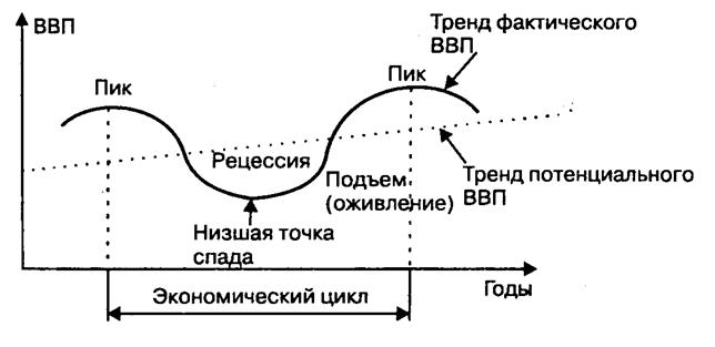 Термин экономический цикл означает следующие один за другим подъемы и спады уровней экономической активности в течении нескольких лет. Отдельные экономические циклы существенно отличаются друг от друга по продолжительности и интенсивности. Нет точной формулы для прогнозирования длительности и временной последовательности экономических циклов. По своей нерегулярности экономические циклы больше напоминают изменения погоды. Тем не менее, все они имеют одни и те же фазы, которые по-разному именуются различными исследователями.