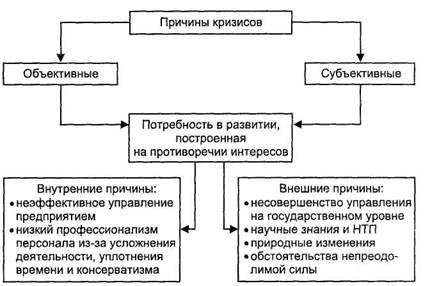 Причины кризиса могут быть внешними и внутренними. Внешние причины кризисов связаны с несовершенством управления на макро- и микроэкономических уровнях, с инновациями (новые научные знания, развитие научно-технического прогресса), с природными изменениями (например, ухудшение экологической ситуации), наконец, с обстоятельствами непреодолимой силы. Внешние причины для возникновения и развития кризиса существуют всегда, поэтому так важно предвидеть его возможные проявления. Внутренние причины кризиса связаны с неэффективным менеджментом на предприятии из-за непрофессионализма персонала, усложнения деятельности вследствие роста масштабов бизнеса и консерватизма личности.