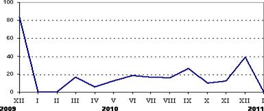 Инвестиции в основной капитал постоянно снижаются. К примеру, в январе 2011 года они сократились на 4,7% по сравнению с январем прошлого года, в феврале этот показатель уменьшился по отношению к февралю 2010-го года еще на 0,4%, с февраля 2008 года по февраль 2011 года инвестиции в основной капитал сократились на 23%.