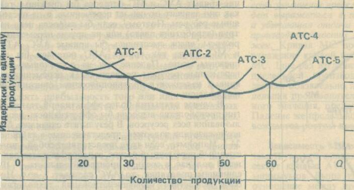 На графике эта закономерность проиллюстрирована применительно к пяти различным размерам предприятия. Кривая АТС-1 показывает динамику средних общих издержек для самого маленького из пяти предприятий, кривая АТС-5 — для самого большого. Соотношение между этими пятью кривыми в точности соответствует изложенному выше правилу. Строительство все более крупных предприятий будет приводить к снижению минимальных издержек на производство единицы продукции вплоть до достижения размеров третье предприятия. Однако за этим пределом расширен производственных мощностей будет означать повышение минимального уровня средних общих издержек.