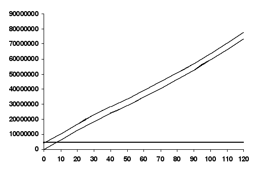 Закон убывающей отдачи находит свое воплощение в форме всех трех кривых. Однако, как следует из приведенной выше формулировки закона, экономистов интересует, прежде всего, предельная производительность. Соответственно мы различаем стадии роста, убывания и отрицательного значения предельной производительности (см. рис. 2а 2б в приложении 2). Еще раз взглянув на колонки 1 и 3 , мы заметим рост отдачи от привлечения к производству первых двух рабочих, убывание отдачи, связанное с использованием труда третьего, четвертого и так далее до восьмого рабочего, и "отрицательную отдачу" (абсолютное уменьшение объема производства), начиная с девятого рабочего [ 18, c. 54].