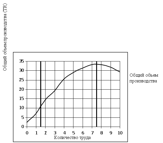 Издержки производства какого-либо продукта данной фирмой зависят не только от цен необходимых ресурсов, но и от технологии — от количества ресурсов, которое необходимо для производства. Именно это, то есть технологический аспект формирования издержек, и интересует нас в данный момент. В течение краткосрочного периода фирма может изменить объем производства путем соединения изменяющегося количества ресурсов с фиксированными мощностями. Вопрос: каким образом будет изменяться объем производства, по мере того как все большее и большее количество переменных ресурсов будет присоединяться к фиксированным ресурсам фирмы? [ 9, c. 321].