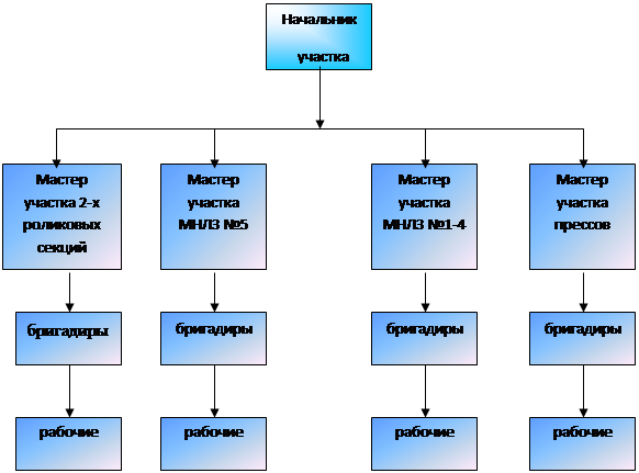 Организуют работу четыре мастера, из них три мастера участка МНЛЗ №1-4 работают по сменам, остальные только в день. Управление осуществляет начальник участка.