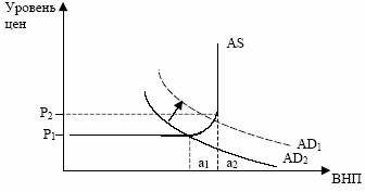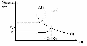 Инфляция спроса (инфляция покупателей) – это избыток в обращении платежных средств (избыток совокупного спроса), наталкивающийся на ограниченное по тем или иным причинам предложение товаров и услуг. Инфляция спроса характерна для ситуации, когда экономика близка к состоянию полной занятости и полной загруженности производственных мощностей (переходный и вертикальный отрезки кривой совокупного предложения AS на рис.2).