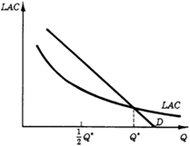 Рисунок показывает, что одна естественная монополия может произвести количество товара Q*, затратив меньше издержек, чем каждая из двух фирм, которая произведёт только 1/2 Q*.