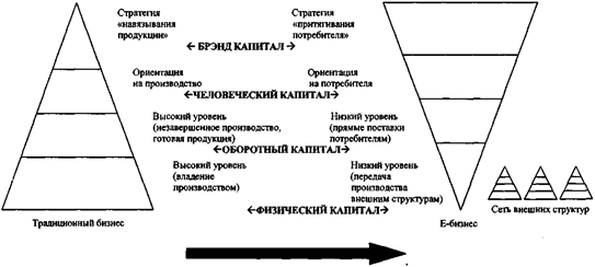 Известные американские исследователи бизнеса Г. Мине и Д. Шнайдер одними из первых предложили новую теорию структуры капитала традиционных и современных компаний. На рис. 8 представлены коренные изменения в структуре капитала традиционного и электронного бизнеса в отраслях В2В (бизнес для бизнеса).