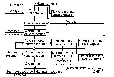 Существует несколько видов технологических схем получения ДМТ. В основном они различаются по способам получения ТФК, которые целиком определяются сырьевыми возможностями той или иной страны. Многие из этих сп особов ис пользуют в промышленности для получения собственно ТФК и для перевода ее этерификацией в диметиловый эфир. Качество ТФК как исходного продукта для синтеза ДМТ во многом определяет и качество сырого диметилтерефталата, наличие в нем различных примесей и побочных продуктов. Так, ДМТ на основе ТФК, полученной при окислении п-ксилола или диизопропилбензола азотной кислотой, содержит значительное количество нитросоединений; ДМТ на основе п-цимола - большое количество побочных продуктов [3, 4]и т.д.