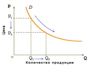 Зависимость между величиной спроса и ценой описывается законом спроса, согласно которому между ценой (P) и спросом (Qd) существует обратная зависимость: при увеличении цены спрос падает, при снижении - растет.