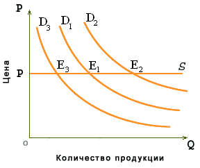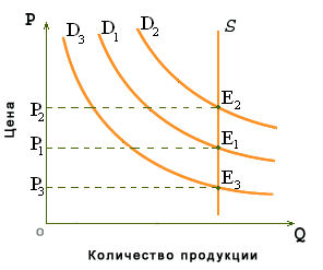 В условиях мгновенного равновесия предложение товаров фиксировано (рис. 3.2.). При данном фиксированном предложении товаров цена полностью зависит от спроса. Увеличение спроса приводит к росту цены, и наоборот, его снижение ведет к падению цены.