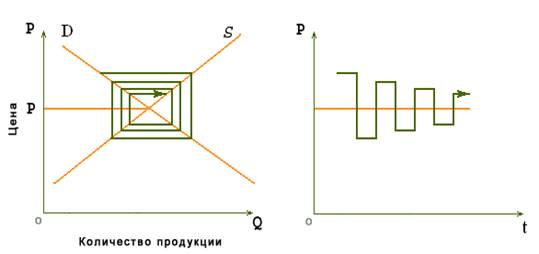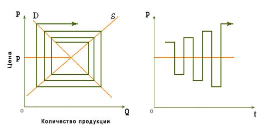 Например, существует регулярный цикл колебаний предложения сельскохозяйственных товаров и их рыночных цен. Но самым обычным является ход событий, отраженный в третьем случае. Такие процессы на практике и их отражение в категориях и на графиках вошли в экономическую науку под названием теоремы Паутины, поскольку рисунок напоминает сетку паутины. Данные процессы представлены на графиках, где на осях абсцисс отображаются количество товара и время.