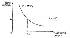 На конкурентном рынке фирма может приобрести столько ресурсов, сколько сочтет необходимым при данной рыночной цене. Рыночная цена определяется соответствием рыночного спроса и рыночного предложения данного ресурса. Если, например, рыночная цена ресурса составит 8 единиц, то для отдельной фирмы это будет означать, что по цене, равной 8 единиц, она может приобрести любое количество ресурса, какое сочтет необходимым. Кроме того, конкурентный рынок ресурса означает, что рыночная цена для отдельной фирмы является величиной заданной, поэтому кривая предложения ресурса будет совершенно эластичной горизонтальной линией, пересекающейся с вертикальной осью в точке, соответствующей рыночной цене (Рис. А.1.).