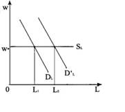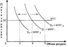 На рис. А.2 демонстрируется изменение спроса на трудовые услуги. Так, в результате увеличение спроса на трудовые услуги произойдет из-за увеличения цены продукта пли из-за увеличения предельного продукта ресурса, то любой из этих факторов увеличит MRP при любом данном уровне использования ресурса и сместит кривую спроса на ресурс от D1 до D2 . И наоборот, понижение цены ресурса или понижение предельного продукта ресурса сократит спрос фирмы на ресурс с D1 до D3. (Рис. А.2.)
