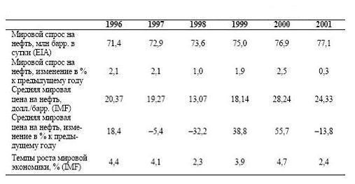 В период 1991–2005 гг., рост мирового ВВП на 1% сопровождался увеличением мирового потребления нефти в среднем на 0,37%. Снижение темпов роста мировой экономики неизменно приводит к падению мировых цен на нефть. Так, при темпах роста мирового ВВП менее 1% в год, такая ситуация имела место в 1998 и 2001 гг., мировые цены на нефть неизменно падали, причем их годовое снижение превышало 10% (Табл. Б.1).