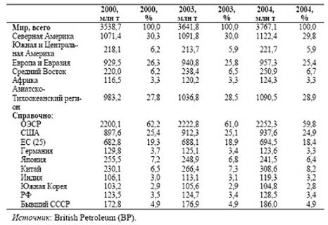 На ведущие промышленно развитые страны – США, страны ЕС и Японию – приходится 50% мирового потребления нефти. В то же время все большую роль в формировании мирового спроса на нефть начинают играть азиатские страны, прежде всего Китай. В целом прирост потребления нефти в странах Азиатско-Тихоокеанского региона за 2001–2004 гг. составил 47% прироста мирового потребления, в том числе Китай – 34%. В Японии, напротив, в последние годы наблюдается снижение потребления нефти (Табл. Б.2).