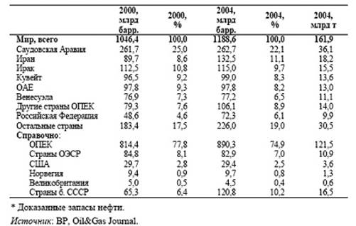 Доказанные мировые запасы нефти в настоящее время составляют 161,9 млрд. т и в целом позволяют обеспечить как текущий, так и перспективный мировой спрос на нефть (обеспеченность текущей мировой добычи нефти доказанными запасами в настоящее время составляет 40,5 года). В то же время географическое распределение запасов нефти крайне неравномерно. Страны – члены ОПЕК контролируют три четверти (74,9% в 2004г.) доказанных мировых запасов нефти. Более 60% доказанных мировых запасов нефти (61,7% в 2004г.) сосредоточено в странах Среднего Востока. При этом 22,1% мировых запасов нефти приходится на Саудовскую Аравию (Таблица Б.6.). В России, по зарубежным данным, доказанные запасы нефти составляют 9,9 млрд.т, что составляет 60% запасов нефти стран на территории бывшего СССР и 6,1% мировых запасов.