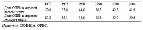 Таблица 2.9. Доля стран ОПЕК в мировой добыче и экспорте нефти в 1970-2004гг.,%