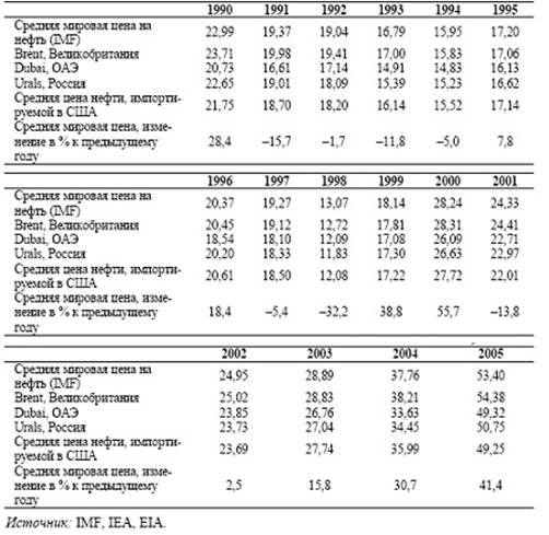 Таблица 2.11. Мировые цены на нефть в 1990-2005гг., долл./барр.