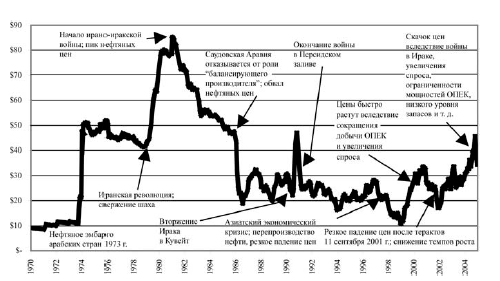 Рис. 2.1. Мировая цена на нефть в реальном выражении (цены 2005 г.) и основные события, 1970–2005 гг.