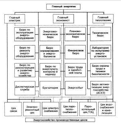 Энергетическое хозяйство крупных промышленных предприятий находится в ведении главного энергетика. Отдел главного энергетика включает бюро (группы) энергоиспользования, энергооборудования, а также электрическую и тепловую лаборатории. Лаборатории организуют и проводят исследовательскую работу по снижению расхода топлива и энергии, разрабатывают и внедряют рациональные режимы работы энергетического оборудования, разрабатывают технически обоснованные нормы потребления энергии и контролируют их выполнение, осуществляют контроль за производством и использованием энергии и энергоносителей на всех установках предприятия.